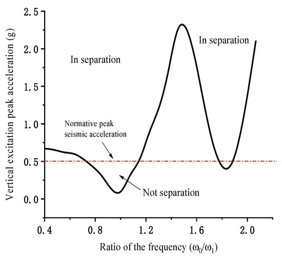 Figure 4 shows the separation of the piers and beams under different excitation frequencies and accelerations. When the (vertical first-order natural frequency) is close to the (excitation frequency), a slight vertical acceleration results in pier–beam separation. When the deviates from the , the vertical excitation acceleration required for the separation increases significantly. When = 40 rad/s, the vertical excitation acceleration needs to reach 2.2 g to cause pier–beam separation. When the is close to the (vertical second-order natural frequency), the smaller excitation acceleration also causes pier–beam separation. Compared with the separation interval near the , the separation interval of the second-order vertical natural frequency is narrower. The excitation acceleration required for the separation is greater, essentially exceeding the standard value. The separation of the bridge piers and beams mainly occurs when .