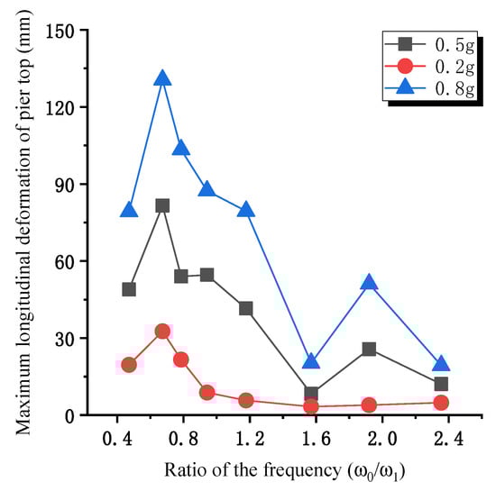 Figure 5 shows the longitudinal deformation of the pier top under different excitation frequencies. When the peak excitation acceleration is 0.2 g, the pier and beam are always in contact, and the maximum deformation of the pier top occurs in the interval . When the peak excitation acceleration of the excitation is 0.5 g and 0.8 g, vertical excitation causes pier–beam separation. When , the peak value of the pier roof deformation appears; is the first longitudinal natural frequency of the structure.