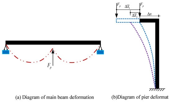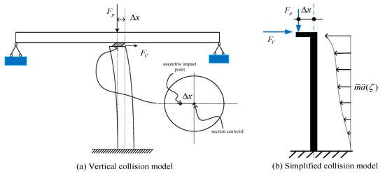 In the previous study, the vertical impact force of the structure was calculated using the model in Figure 6. In the actual collision process, the pier is in a longitudinal bending state. The eccentric distance between the vertical collision position of the pier beam and the pier axis is . To simplify the calculation, the structural collision model is simplified as Figure 6b. In the process of a vertical collision, the structure is affected by three forces: the vertical collision force, the bearing shear force, and the inertial force of the forced vibration of the piers. The indirect mode method [] is adopted for the calculation, and the change in the bending strain energy of the bridge pier caused by the initial offset of the bridge pier during collision is ignored.