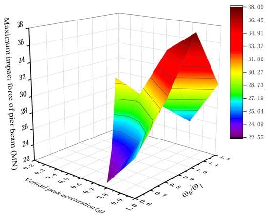 Figure 10 shows the vertical impact force under different levels of vertical peak excitation acceleration and excitation frequency. From the analysis, we concluded the following: (1) the maximum impact force of the pier beam increases monotonically with the increase in vertical excitation acceleration, and the slight fluctuation in the middle is due to the fact that the upthrow velocity in the middle of the main beam has a certain contingency at the vertical separation moment; (2) the collision mainly occurs when , and the closer the two frequencies, the greater the collision force; (3) when the excitation frequency/natural vertical frequency is <0.8 or >1.2, the change in excitation frequency has little influence on the maximum impact force of the pier beam.