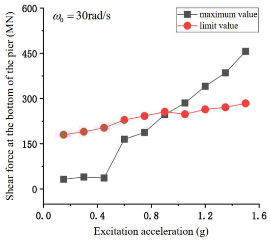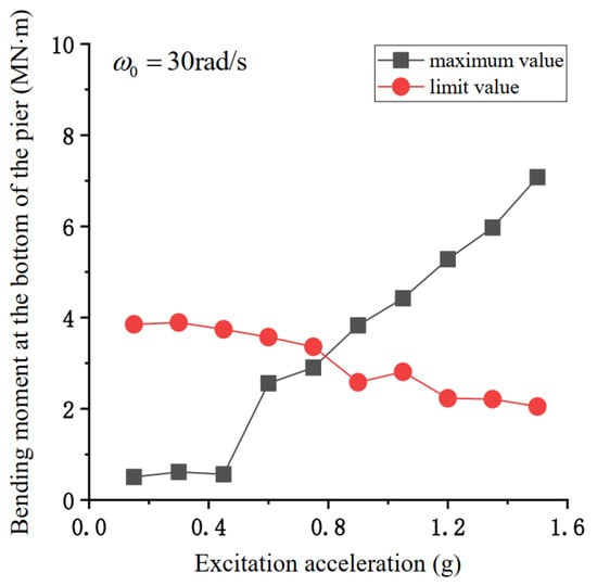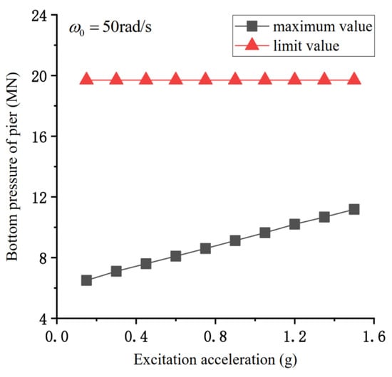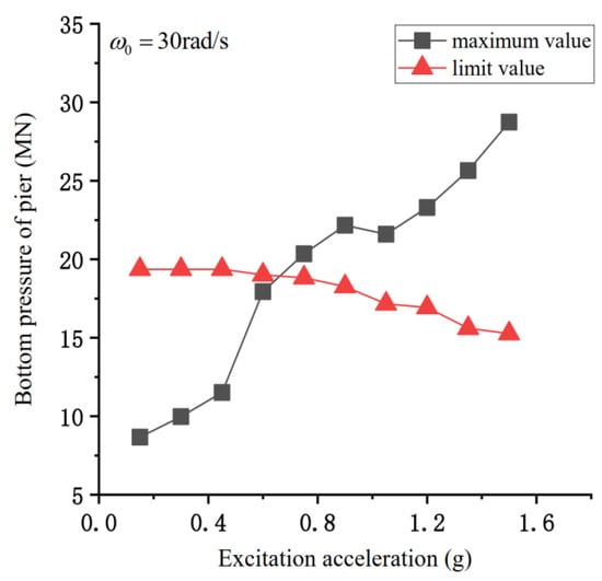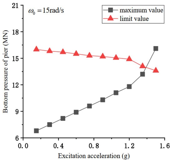 Figure 13 shows the changes in the maximum and allowable values of pier bottom pressure under different excitation amplitudes when = 15 rad/s. At this point, the excitation frequency deviates from the natural vertical frequency of the bridge but approaches the longitudinal excitation frequency of the bridge. When the peak seismic acceleration is less than 1.2 g, the maximum pressure at the pier bottom increases monotonically with the increase in excitation. By contrast, the extreme deformation value at the pier top changes little. When the peak excitation acceleration exceeds 1.2 g, the structure separates and undergoes a small mutation, leading to a further decrease in the allowable pier pressure. When the peak excitation acceleration exceeds 1.5 g, the pier is destroyed under compression.