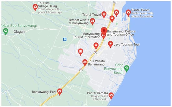 Several areas fall into the category of ecotourism in Indonesia, one of which is Banyuwangi. Banyuwangi’s ecotourism won the world championship in 2016 at the 12th United Nations World Tourism Organization (UNWTO) awards. This event was under the auspices of the United Nations in world tourism and took place in Madrid, Spain [] (the area is presented in Figure 1). With the achievement of the award and the development of tourism growth in Banyuwangi Regency, the local government needs to optimize the existing tourism potential. This approach is necessary so that tourism growth can continue to be controlled in order to manage the outbreak of the COVID-19 pandemic []. Increasing and controlling the number of tourist visits can be prepared by measuring tourists’ behavioral intentions. If the tourism destination can create positive behavioral intentions for tourists, then the tourist destination will be able to survive by conserving nature and creating sustainable ecotourism. To build tourists’ behavioral intentions, tourism providers and the government need to know what factors can influence behavioral intentions [].