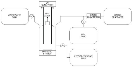 The conducted research on ozonation of wastewater in order to degrade recalcitrant contaminants does not give satisfactory results [3,4]. In the conventional ozonation process, ozone decomposes to oxygen immediately after its production due to a very short half-life in the aquatic environment [3,4]. This causes problems in the implementation of the process, such as high cost and the requirement for ozone generation on site. Some of the impurities present in the wastewater are persistent for ozone due to its selectivity in the oxidation of some organic compounds [3,4,5,6]. For this reason, ozone is often used in combination with other processes and oxidants, such as electrolysis [5,6] and H2O2 [7,8]. These connections increase the efficiency of pollutant degradation. Although the combination of O3 processes and electrolysis have a large potential for removing contaminants, there are contaminants which in comparison with each of these processes separately, continue to generate problems in the process due to the limited adaptability of ozone generators [9].