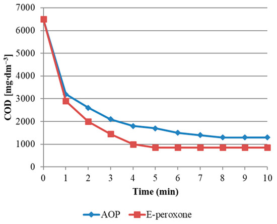 COD reduction in the analyzed wastewater is presented in Figure 2. For the analyzed oxidation processes, a 30% COD reduction between 2 and 3 min of reaction was obtained. After this period, the AOP process slowed down its speed, and. E-peroxone proceeded at a similar speed. After completion of the reaction at 10 min, both processes obtained similar COD reduction results, which differed by 450 mg/dm3 COD.