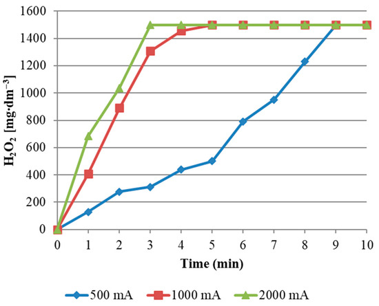 Electro-generation of H2O2 (experimental conditions: reactor volume of 2.5 dm3; applied current of 500, 1000 and 2000 mA; ozone flow rate of 30 dm3∙h−1).