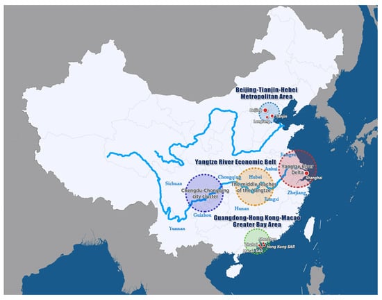 - Liu, Y.; Zhang, X.; Pan, X.; Ma, X.; Tang, M. The spatial integration and coordinated industrial development of urban agglomerations in the Yangtze River Economic Belt, China. Cities 2020, 104, 102801. [Google Scholar] [CrossRef]