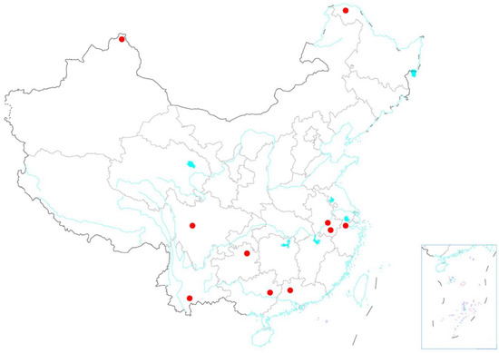 Location of the top 10 most popular rural tourism destinations in China from 2011 to 2021 (The red dots in the map indicate the geographic location of rural tourism destinations).