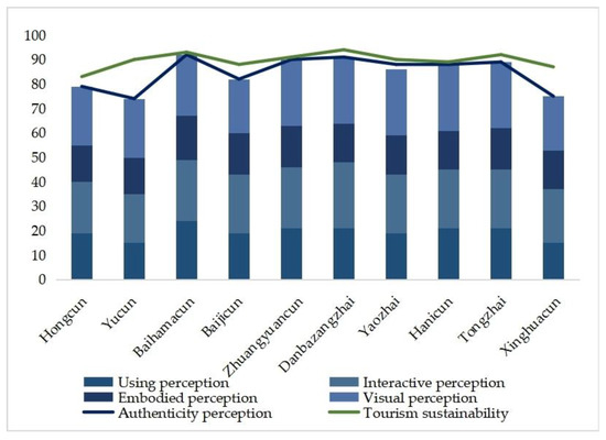 Authenticity is positively correlated with rural tourism sustainability. For ten rural tourism destinations, the sustainability scores are all higher than 80. As tourists prefer well-protected villages, it brings sufficient funds for tourism development. In the process of tourism experience, it will stimulate tourists’ willingness for ecological protection and cultural inheritance. For example, in the ten villages studied in this paper, the per capita income of local residents reached RMB 50,000, exceeding the per capita income in China. The money invested by the government in environmental protection accounts for 5% of the total fiscal expenditure every year, and the money used for cultural relics restoration, handicraft inheritance, and education accounts for 20% of the total fiscal expenditure.