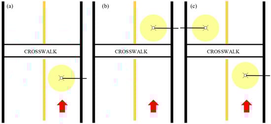 Midblock crosswalk lighting designs that were evaluated in the study: (a) positive contrast—luminaire was located before the crosswalk; (b) negative contrast—luminaire was located after the crosswalk; and (c) staggered—luminaires were located before the crosswalk in both directions of travel. Please note: figures are not photometrically accurate. The red arrows represent the direction of approach of a vehicle.