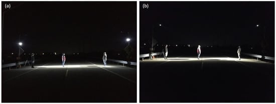 For the midblock crosswalk, four designs were evaluated. All luminaires were of Type II and were a CCT of 4000 K. Type II luminaires have a light distribution with a preferred lateral width of 25 degrees and are intended for installations where the fixture is placed at the edge of a roadway. In the first design, the crosswalk was illuminated on the approach side (rendering the pedestrian at the entrance in positive contrast—Figure 1a). In the second crosswalk design (Figure 1b and Figure 2b), the exit of the crosswalk was illuminated, rendering the pedestrian in negative contrast. The third and final design considered lighting both the approaches of a two-lane road, with one lane for each direction of travel (Figure 1c and Figure 2a). It should be noted that the representations in Figure 1 are not photometrically accurate and are merely illustrations to show the location of the luminaires with respect to the crosswalk. Further, in realistic roadway conditions, contrast is never constant and changes as a function of the distance between the observer’s vehicle and the pedestrian at the crosswalk []. Thus, it would be very difficult to establish a contrast metric for pedestrians at crosswalks. The designation of positive and negative contrast in this study was purely to determine the position of the light source with respect to the pedestrian at the crosswalk.