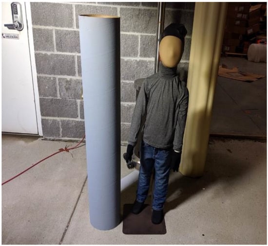 The experimental trials began once the participants indicated they were ready. Each time the participant drove through the test area, a different lighting design and light level would be presented at the midblock crosswalk. Additionally, the mannequins appeared at different locations relative to the crosswalks. As the participant drove, they were instructed to say the word “pedestrian,” “kid,” or “child” (whichever is easiest for them to remember) whenever they saw one of the child-sized mannequins. The in-vehicle experimenter pressed a handheld button each time a mannequin was identified. Later analysis of the data would determine the distance between this point and the mannequin, which was reported as the “detection distance.” During pilot testing, full- vs. child-sized mannequins were evaluated for their suitability, as child-sized mannequins are smaller and more difficult (making them a more critical object) to detect than adult-sized ones. Each mannequin was 1.2 m (46 inches) in height. Child-sized mannequins were outfitted in gray-colored scrubs, as shown in Figure 4. Grey was chosen because it is a neutral color, and it is rendered similarly under different illuminance levels and lighting designs. Mannequins were located at the entrance, middle, and exit of the midblock crosswalk (see Figure 5).