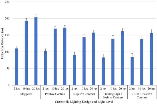 Effect of lighting design on detection distance at the medium light level at the midblock crosswalk. Values are means of detection distances, and error bars indicate standard errors.