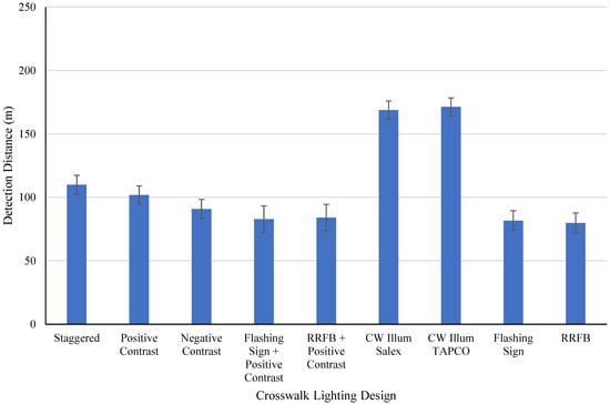 Effect of lighting design on detection distance at the high light level at the midblock crosswalk. Values are means of detection distances, and error bars indicate standard errors.