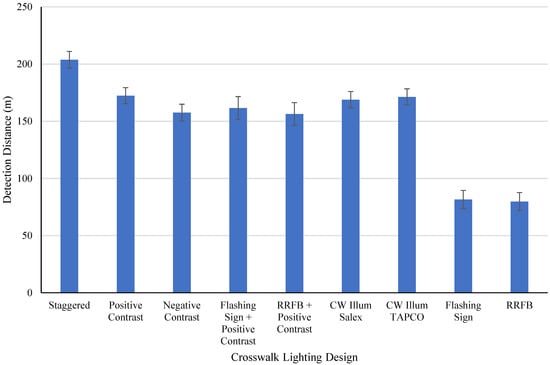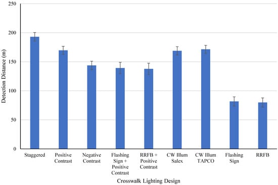 Effect of lighting design on detection distance at the low light level at the midblock crosswalk. Values are means of detection distances, and error bars indicate standard errors.