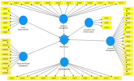 As shown in Figure 1, the proposed study model includes time overrun as a dependent variable. Each of the six groups/constructs has its own set of independent latent variables, such as Design and Project Management, Contract Management, Resource Management, Site Management, Client Responsibilities, and Information and Communication.
