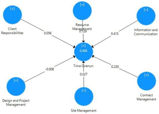 Endogenous R2 of 0.26 or higher is considered significant. If R2 is less than or equal to 0.02 and greater than or equal to 0.13, but less than or equal to 0.26 [], it is considered weak. Figure 3 shows that R2 for the endogenous variable, time overrun, is 0.484, indicating that the model’s ability to explain events is significant. Furthermore, the model demonstrates that communication and information issues are the primary causes of time overruns. The second most important factor contributing to time overruns in Pakistani construction projects is contract management. Contract management is critical to the success of construction projects. The detailed challenge categories and key challenges are shown in Table 5.