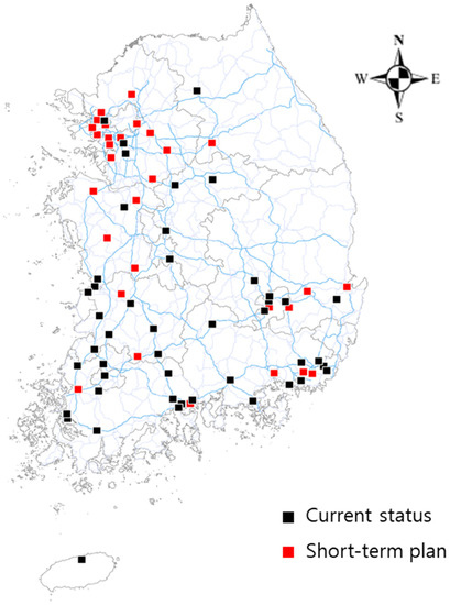 In order to solve the traffic safety and parking problems and to make comfortable and safe living zones, the Ministry of Land, Infrastructure and Transport announced a plan to expand the truck public parking lots in urban areas through the ‘4th Comprehensive Plan for Expansion of Truck Resting Facilities (2020–2024)’ [2]. This plan includes the short-term plan to expand 30 public parking lots by 2030 (Figure 1) and the long-term plan to add 32 public parking lots by 2050. Although the demand and the construction plan for the truck public parking lots in each administrative area has been identified, no comprehensive implementation plans, such as location selection, have been provided. With the growth of the e-commerce business, more parcel delivery vehicles are now traveling through urban areas. It is urgent to provide sufficient parking facilities for truck drivers and to provide citizens with a comfortable living environment.