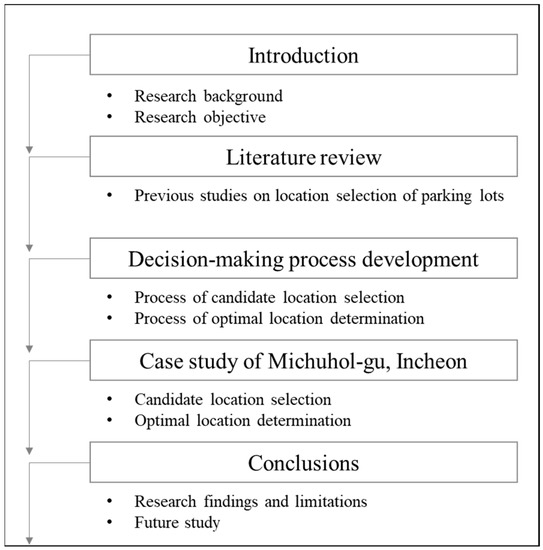 Public parking lots for trucks have a different function than the normal parking lots in Korea. Unlike the normal parking lots, which are usually located near the commercial centers to serve all drivers who park their cars for several hours, the truck public parking lots only provide parking service for commercial trucks. Truck drivers can also maintain the trucks at the truck public parking lots. Therefore, the area of a truck public parking lot is wider than the normal parking lots. Due to the limited land usage, finding an optimal location for a public parking lot is difficult [3]. To construct truck public parking lots in urban areas efficiently, this study aims to develop a decision-making process for the location selection of truck public parking lots. Compared with most location problem studies of parking facilities, which exclude the phase of candidate location selection, this paper presents a decision-making process that includes candidate location selection based on geographic information system (GIS) spatial analysis and optimal location determination by applying a competitive p-median algorithm. Furthermore, Michuhol-gu in Incheon, where it is urgent to expand the parking space for trucks, will be analyzed as a case study to validate the presented decision-making process. In order to enable local governments to effectively apply the decision-making process to the construction of truck public parking lots, this study proposes a more systematic and universal location selection process, including the standard establishment, data collection and processing, and methodology application. This study can be widely utilized as a guideline for the government to construct truck public parking lots in urban areas. The flow of this study is as below (Figure 2).