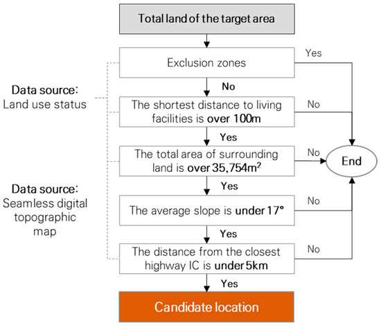 The exclusion zones mean the lands that already have existing facilities or are restricted from being developed (including the urban planning ordinance). Based on the ‘Enforcement Rules of the Parking Lot Act’ and Go et al. [3], the shortest distance to living facilities can be arranged as in Table 2. In this study, the shortest distance to living facilities was set by the strictest standard of 100 m (based on the boundaries).