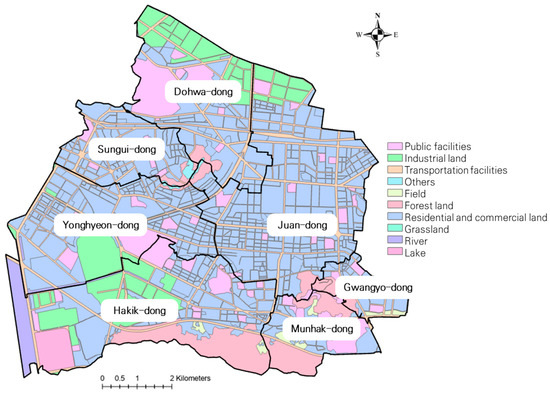 The candidate locations for the truck public parking lots in Michuhol-gu were selected by the process presented in Section 3.1. The overall land use status of Michuhol-gu was selected in the National Geospatial Information Portal and analyzed by ArcGIS Pro (Figure 4). Until July 2021, the total land area of Michuhol-gu was about 24,867,000 m2, and the residential and commercial areas were 21,834,000 m2, accounting for 88%.