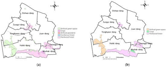 When applying the competitive p-median algorithm, which considered the existing lots’ locations, 627 Yonghyeon-dong was presented as the best location in Michuhol-gu (Figure 8a). If two public parking lots for trucks were needed, 83 Hakik-dong would be the other optimal location (Figure 8b). Detailed information about each location is shown in Table 7.