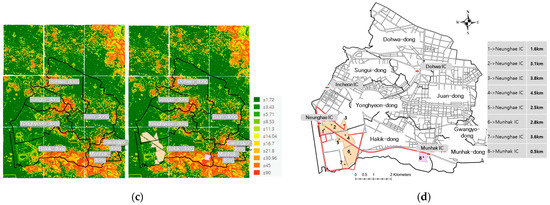 - Excluding the lands with a driving distance of more than 5 km to the highway IC (Figure 5d).