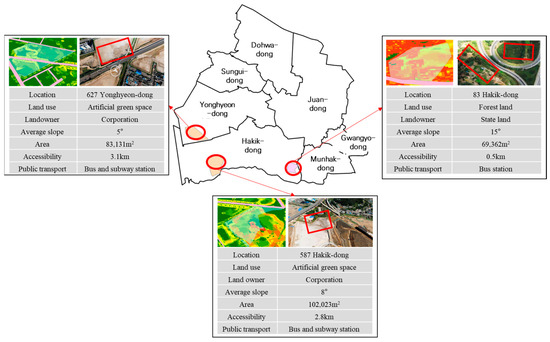 In the final stage of the candidate location selection, this paper accurately identified the actual land condition and presents three candidate locations for the truck public parking lots in Michuhol-gu, as shown in Figure 6.