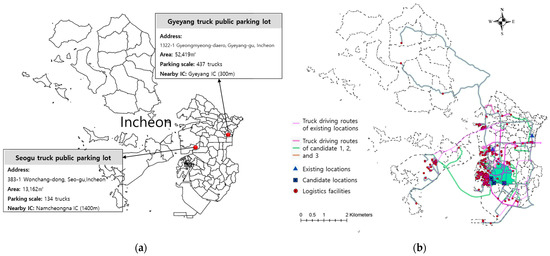 The existing truck public parking lots in Incheon were confirmed by the Taxi and Logistics Division of Incheon City (April 2022). There are two existing truck public parking lots; one is located in Seogu, and the other is located in Gyeyang (Figure 7a). By using the truck vehicle travel time analysis function provided by ArcGIS Pro, the driving time from the candidate locations to the logistics facilities was derived (Figure 7b).