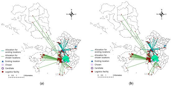 Results of optimal location selection. (a) p = 1. (b) p = 2.