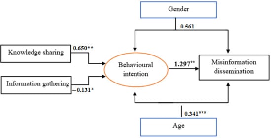 Similarly, the study found a strong significant relationship between behavioural intention and misinformation dissemination (t = 12.870, p > 0.000). Thus, the indication here is that knowledge sharing has a strong relationship with the behavioural intention to use social media, further leading to the dissemination of misinformation through digital platforms. Finally, the study proposed a mediating impact of gender and age on the dissemination of misinformation through digital platforms. The proposed indirect effects remain positively significant (t = 0.561 and 0.341, p > 0.003 and p > 0.021, respectively).