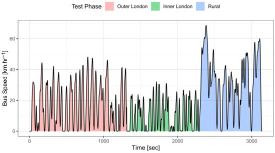 Although there is some evidence that exhaust emissions may be higher and/or varying in size distribution under different operating conditions, e.g., during cold start [27], exhaust filter regeneration [28] or when emissions control systems have been tampered with [29], on-road surveillance indicates that these are similar to those observed for real-world bus fleets (see, e.g., [30,31], Euro VI Bus ca. 5 mg.veh.km).