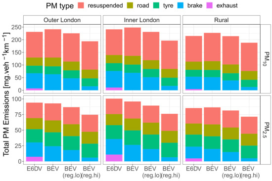 Exhaust were determined for E6DV buses on urban, rural and motorway routes using UK NAEI methods, i.e., using the COPERT 5 (https://www.emisia.com/utilities/copert/ (accessed on 20 November 2022) emissions speed profiles via VEIN [25] and typical bus speeds (as reported in Brown et al. [26]; 32, 62 and 82 km.h, respectively), assuming 0% road slope, to give , and of 4.7, 3.2 and 3.1 mg.veh.km, respectively. exhaust emissions are predominately much smaller than 2.5 m, especially for modern vehicles such as the E6DV buses considered here, so we assume, in line with NAEI practices:
