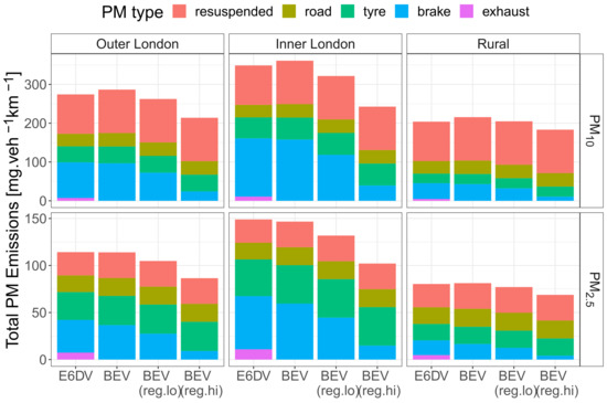 Brake dust is typically produced as the result of mechanical action during breaking events, and a range of factors have been associated with instantaneous emission rates, including composition brake pads, design of braking mechanism, vehicle mass, brake temperature and driving conditions (see, e.g., [12,32,33]). NAEI methods provide initial estimates of of 53.6, 27.1 and 8.4 mg.km for on urban, rural and motorway routes, respectively, and 21.4, 10.8 and 3.4 mg.km for on urban, rural and motorway routes, respectively [34]. In a conventional assessment, the same factors would be applied to all E6DV and BEV buses regardless of age, weight or brake technology used by the bus or the traffic conditions, e.g., free-flow or congested.