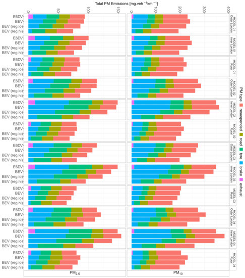 - Beddows, D.C.; Harrison, R.M. PM10 and PM2.5 emission factors for non-exhaust particles from road vehicles: Dependence upon vehicle mass and implications for battery electric vehicles. Atmos. Environ. 2021, 244, 117886. [Google Scholar] [CrossRef]