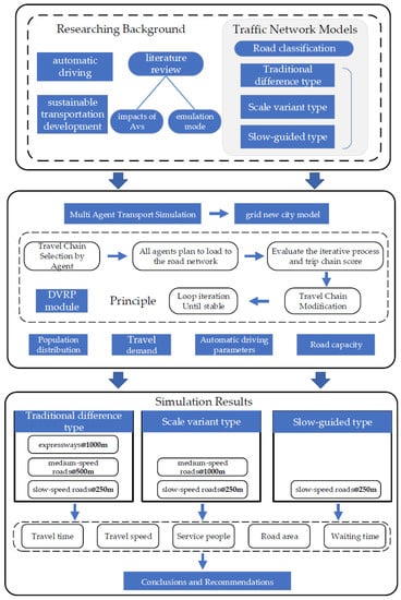 Autonomous driving technology will bring revolutionary changes to the development of future cities and transportation. In order to study the impact of autonomous driving on urban transportation networks, this paper first summarizes the development status of autonomous driving technology, and then three space–traffic network coupling models are proposed based on the differences of speed and space, which are the traditional difference type, scale variation type, and slow-guided type. On this basis, a new 4 * 4 km grid city model is constructed. Based on the MATSim multi-agent simulation method, the traffic parameters of the three models are studied. The results show that under the same traffic demand, the service scale and level of the three traffic networks are significantly different. The optimal service level of the traditional differential type is 2.15 times the efficiency of the slow-guided type. Under the same demand and road network mode, the travel speed of the autonomous driving mode is 1.7–2.8 times that of the traditional mode. Under the same lane area ratio, the travel speed of traditional driving is much smaller than that of autonomous driving, which is about 2.6–3.6 times greater than the former. The research conclusion has certain reference significance for formulating urban spatial development strategies and policies under autonomous driving environments and for promoting the sustainable development of urban transportation.