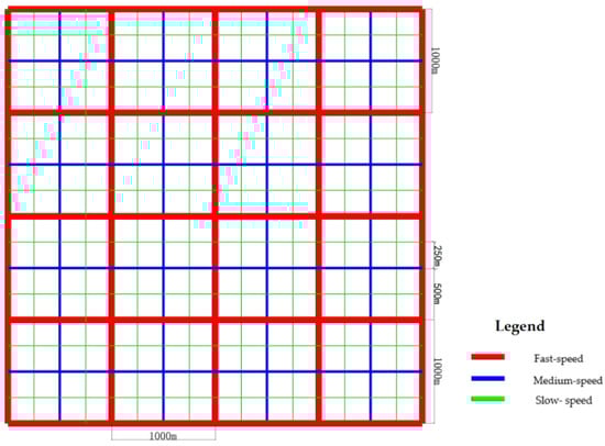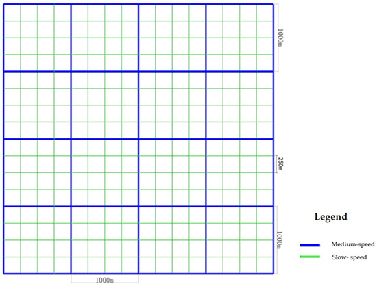 As shown in Figure 2, red is the expressway with a distance of 1000 m, blue is a medium-speed road with a distance of 500 m, and green is a slow road with a spacing of 250 m.