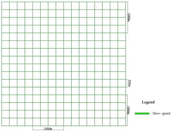 For the road network scheme of Option 1, the spacing of the medium-speed road was 500 m, basically following the spacing of the main and secondary roads of the traditional roads. Considering the higher efficiency of autonomous driving, the road spacing of the medium-speed road network was further expanded from 500 to 1000 m to reach the standard of the spacing of the fast road network, and the slow road network remained unchanged.