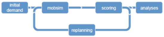 MATSim (multi-agent transport simulation) is a traffic simulation software platform developed by the research team of Prof. Kay W. Axhausen of the Swiss Federal Institute of Technology, Prof. Kai Nagel’s research team of the Technical University of Berlin, Germany, and the Swiss company Senozon. MATSim uses agents as simulation units, simulates all agents’ trips and activities, and optimizes the agents’ travel and activity plans for a day by interacting with multiple agents to realize the simulation of multiple traffic modes in large-scale traffic networks, the simulation process is shown in Figure 5 [,,,].