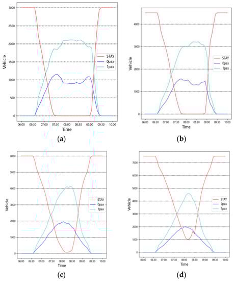 Figure 6 shows the movement of a selected fleet size during the morning rush hour, with empty vehicles moving towards customers (blue), passengers picking up (cyan), and vehicles waiting for service (red). At the time of 3000 shared autonomous vehicles, there was a significant shortage of vehicles, and the data showed that only 64,958 trips were served, accounting for 81.2% of the total number of trips. When more than 6000 shared autonomous vehicles were served, the data showed that about 80,000 trips were served, but when there were 7500 vehicles, a large number of vehicles were idle, as shown in Table 2. Therefore, based on the simulation of the fleet sizes, we thought that a size of around 6000 was appropriate. With such a fleet size, the average waiting time for passengers was about 2.5 min, and the 95th percentile was less than 6 min; such a waiting time is acceptable.