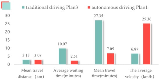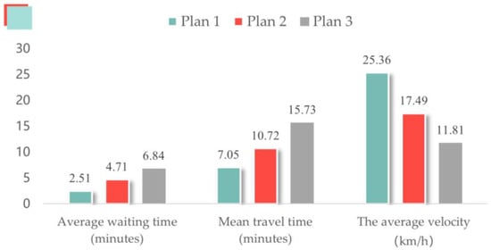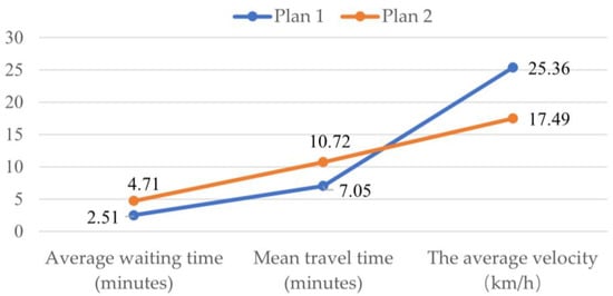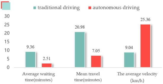(5) Under the background of autonomous driving, from options 1 to 3, the waiting and travel times gradually lengthened, increasing by 2.7 and 2.2 times, respectively, while the travel speed decreased by 2.14 times, as shown in Figure 11.