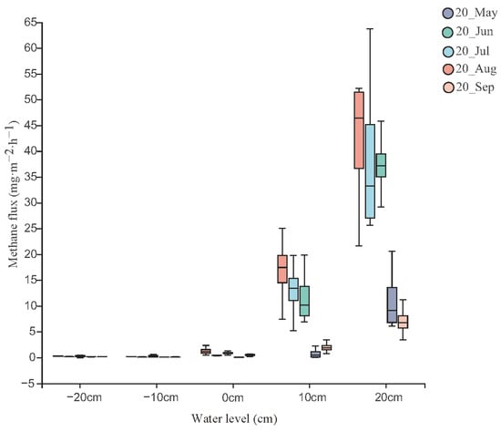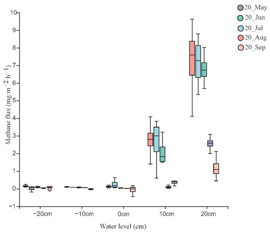 In additive-free carbon experiments, CH4-C was shown in Figure 3 at various water levels during the growing season and increased as the water levels rose. There was only a small sample of CH4-C in sample boxes of water levels within −20~0 cm and the average emission rates were 0.03 ± 0.02 mgm−2h−1, 0.05 ± 0.03 mgm−2h−1, and 0.07 ± 0.05 mgm−2h−1, respectively. CH4-C at a 10 cm water level increased significantly and the average emission rate was 1.36 ± 0.34 mgm−2h−1. When the water level rose to 20 cm, CH4-C increased rapidly, reaching 4.25 ± 0.77 mgm−2h−1.