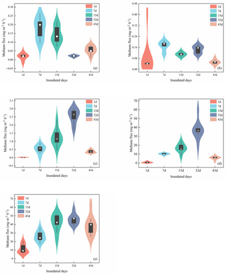 Methane flux varies with inundated days under different water tables. (a) −20 cm water table; (b) −00 cm water table; (c) 0 cm water table; (d) 10 cm water table; (e) 20 cm water table.