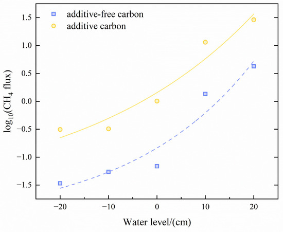 After water level rose to 10 cm, CH4-C rapidly increased and the maximum value occurred at 20 cm water level. The results demonstrated that with the increase in water level, its contribution to the promotion of CH4-C would increase. Furthermore, when the soil was not in an inundated condition, methane production and emission were less affected by water level change. In additive-free carbon experiments, CH4-C had a significant relationship with the water tables (R2 = 0.8791, p < 0.01), and there was only a small amount of emissions within −10~0 cm. After water level rose to 10 cm, CH4-C increased noticeably, and CH4-C rates showed greater growth when water level continued to rise to 20 cm. In additive carbon experiments, CH4-C had a significant relationship, and it increased exponentially as water levels rose, which was similar to additive-free carbon experiments (R2 = 0.915). CH4-C had significant differences within −20~10 cm (p = 0.000; p = 0.000; p = 0.000; p = 0.001) (Figure 7). The rise of water level caused the reduction in that soil dissolved oxygen, and then suppressed the oxidation of methane and increased CH4-C because methane was produced under anaerobic conditions.