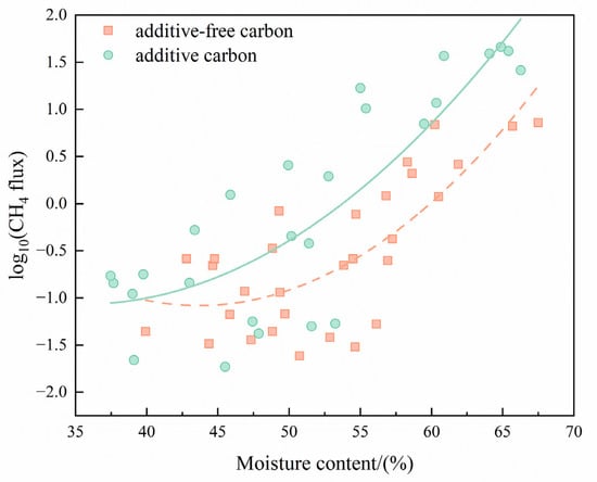 By measuring the moisture content of the soil, there was a good binomial relationship between CH4-C and soil moisture content, which indicated that soil moisture was the main factor affecting CH4-C (Figure 8). In additive-free carbon experiments, the average moisture contents of soil within −20~20 cm were 42.66 ± 1.54%, 49.01 ± 1.32%, 49.49 ± 1.74%, 55.71 ± 1.74%, and 60.38 ± 1.79%, respectively. There was a significantly positive relationship between CH4-C and the soil moisture contents (R2 = 0.7624). In additive carbon soil, the average moisture contents within −20~20 cm were 41.89 ± 1.75%, 45.36 ± 2.68%, 50.33 ± 2.51%, 58.27 ± 1.91%, and 65.26 ± 1.58%, respectively. There was a significant relationship between CH4-C and the soil moisture contents (R2 = 0.8319).