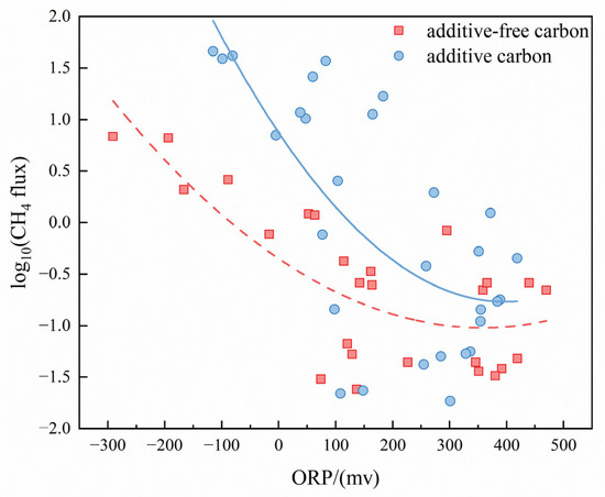 According to the results of the soil redox potential (Eh), there was a good binomial relationship between CH4-C and soil Eh values (Figure 9). In additive-free carbon experiments, the average Eh values of soil within −20~20 cm were 360.87 ± 29.67 mV, 348.71 ± 16.62 mV, 286.21 ± 44.34 mV, −31.34 ± 52.48 mV, and −140.46 ± 54.83 mV, respectively. There was a significantly positive relationship between CH4-C and soil Eh values (R2 = 0.8693). In additive carbon soil, the average Eh values within −20~20 cm were 291.85 ± 33.60 mV, 276.74 ± 28.31 mV, 265.79 ± 29.91 mV, 129.91 ± 25.83 mV, and −18.47 ± 32.21 mV, respectively. CH4-C had a significant relationship with soil Eh value (R2 = 0.6979).