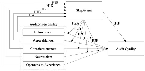 Weiner’s [64] attribution theory explains how people explain why events occur and how they respond to them. The auditors’ competence in fraud detection can be explained by attribution theory. The attribution theory was developed by Fritz Heider [65] in 1958 and is described as the cognitive processes that are used to draw conclusions about the factors that influence behavior [66]. In auditing, attribution theory is used to examine the application of professional skepticism and the ability of auditors to detect fraud. A person always analyzes the behavior of others from different angles in order to discover the hidden meaning behind the behavior. Just as this study explores the relationship between personality traits, professional doubt, and audit quality, therefore, the hypotheses of this study are detailed as follows, as well as depicted in Figure 1.