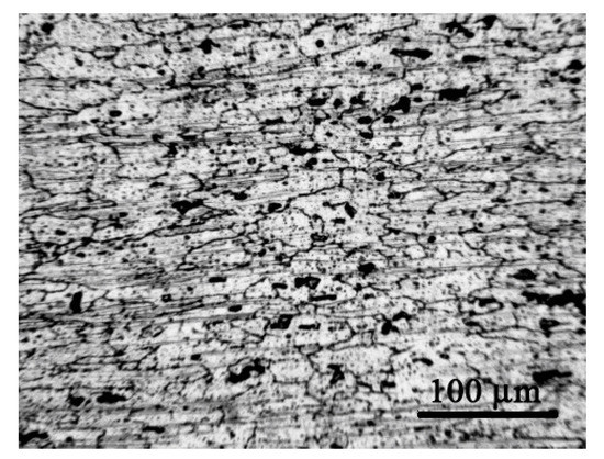 The aluminum alloy AlMg4.5Mn microstructure is shown in Figure 1. This structure is typical of rolled plates, with a fine Mg2Al3 precipitate on the grain boundary and relatively large Mg2Si and (Fe, Mn)Al6 microconstituents. Table 1 presents its chemical composition, while Table 2 presents the tensile properties, taken as the minimum values from standard testing of round specimens of diameter 6 mm [5,31]. The results for the tensile properties, as presented in [5], showed very small scatter, of less than 1%.