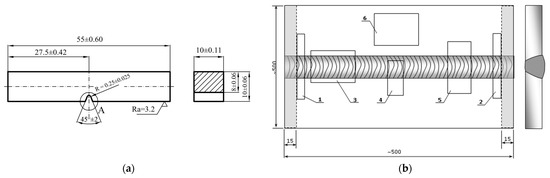 Specimens for standard Charpy testing with a “V” notch (Figure 4a), were cut out from welded plates, with the notch located in the center of the weld metal (Figure 4b). After impact testing, fractographic analysis of the fractured surfaces was carried out.