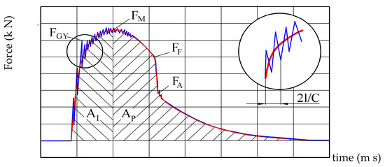 Impact testing on standard Charpy specimens was performed on the instrumented Charpy pendulum, which enables separation of the total impact energy, Et, into the crack initiation energy, Ein, and the crack propagation energy, Epr. In Figure 5, a diagram of force (F) versus time (t), obtained by the instrumented Charpy pendulum is shown schematically for surfaces Ai and Ap, left and right from the maximum force [31]. The ratios of Ai and Ap with the total surface are measures of the energy for crack initiation, Ei, and propagation, Ep, respectively. These two energies are recorded on the instrumented Charpy pendulum and are provided directly as the result of impact testing.
