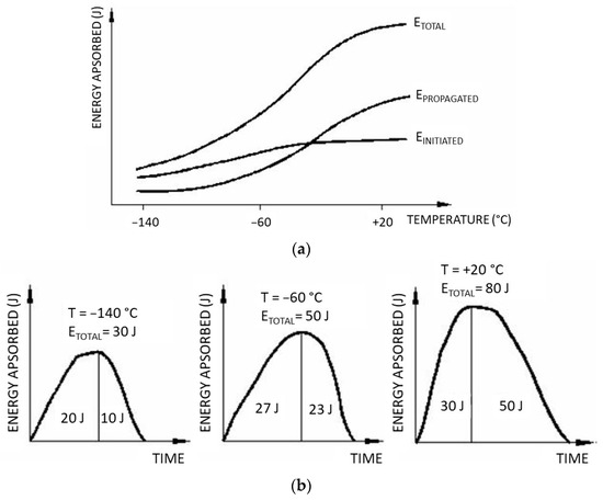 The ductile–brittle transition is another important aspect of material behavior under impact loading, especially in the case of welded joints, due to their heterogeneity. An analysis of this transition was performed for welds by full three-dimensional transient analyses of Charpy impact specimens [27]. A further application of the instrumented Charpy pendulum includes the impact testing of polymers, based on a vibrational wave superimposed on the load-deflection curve, as described in [28].